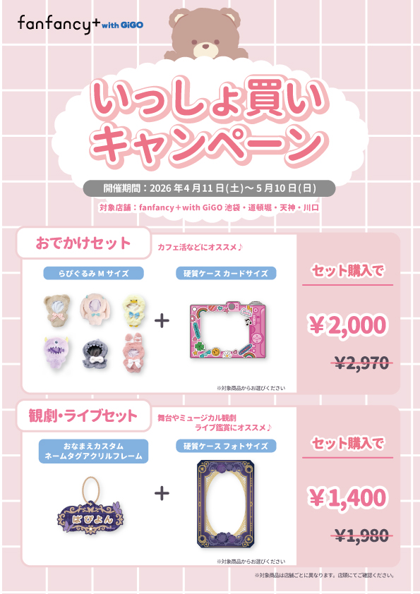 【4/11~5/10】店舗限定キャンペーン! fanfancy+ with GiGOキャンペーン情報 2種類のお得なセット販売が決定! 期間4/11(土)~5/10(日) 対象fanfancy+ with GiGO池袋・川口・道頓堀・天神 セット内容、対象商品など 詳細は画像をご確認ください。 GWのおでかけ、イベント準備にぜひご利用ください! 店舗一覧はこちら