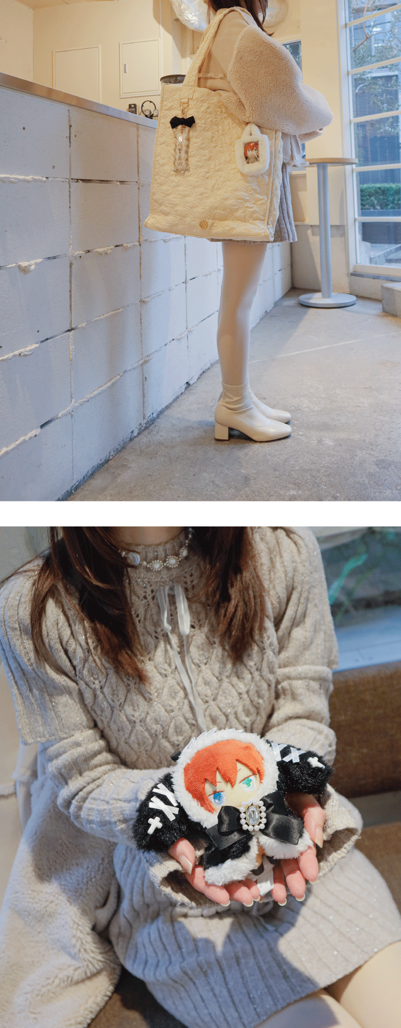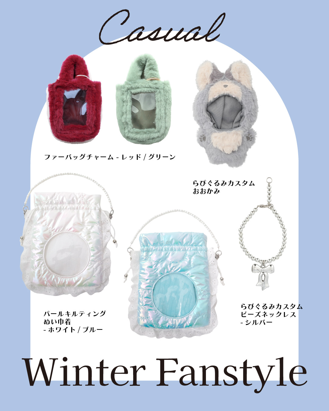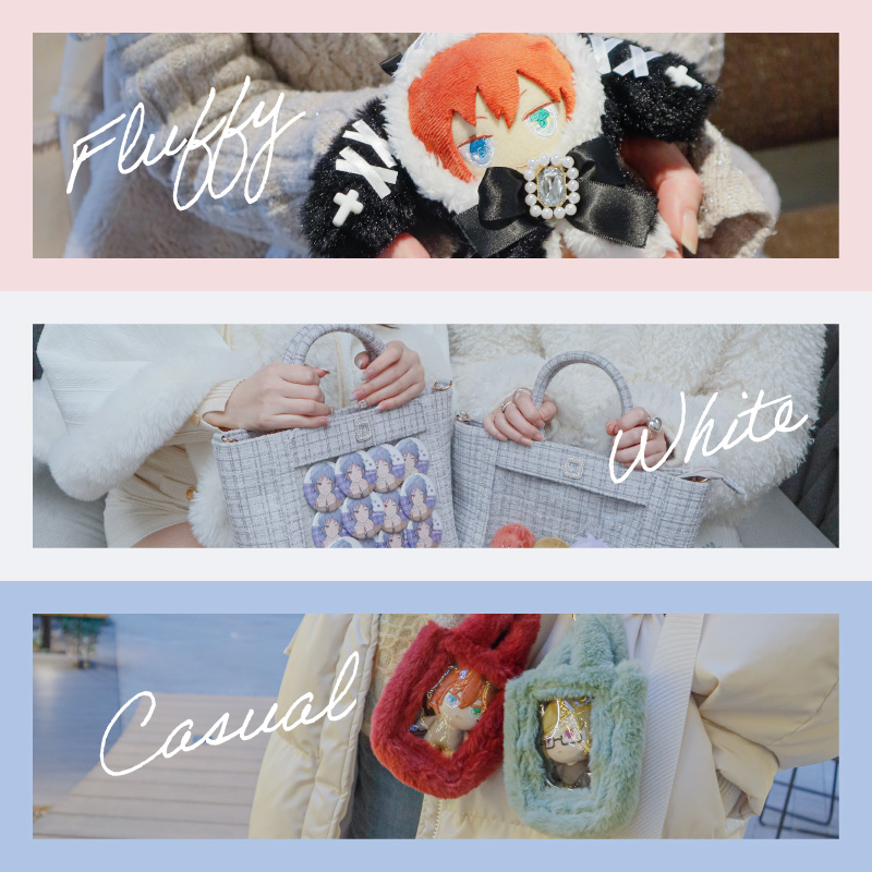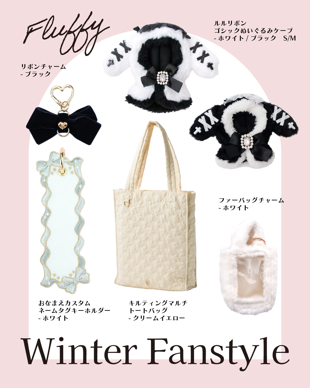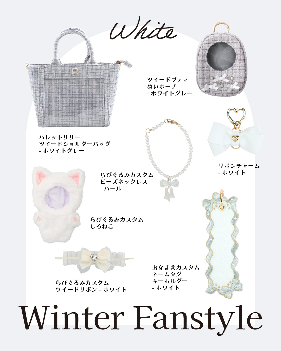 【ファンスタイル特集】冬のふわもこお出かけスタイル 寒い日も、推しと一緒にお出かけしたい!コートを着たまま外でもかわいく写真が撮りたい!ふわふわもこもこのファッションに合わせて楽しめるfanfancy+の冬コーディネートをご紹介今回は3つのファンスタイルシーンをピックアップ!□ Scene 1 Fluffy冬の現場に防寒&しっかりかわいく!□ Scene 2 White真っ白がかわいいホワイトコーデ□ Scene 3 Casualカジュアルスタイルに遊び小物をプラス Scene 1 Fluffy 冬の現場に防寒&しっかりかわいく! 淡い色のふわふわファーコートを着たら、ぬいにもふわふわのケープを付けておめかし。うちわやペンライトの収納がついた大きなマルチトートにはぬいを入れたファーバッグチャームや推しの名前で作るネームタグキーホルダーでカスタマイズ。 キルティングマルチトートバッグ〔クリームイエロー〕5,500円/おなまえカスタム ネームタグキーホルダー〔ホワイト〕1,980円~/おなまえカスタム リボンチャーム〔ブラック〕880円/ルルリボン ゴシックぬいぐるみケープ〔ブラック/ホワイト〕2,090円~2,420円/ファーバッグチャーム〔ホワイト〕880円(1月31日店舗発売) Scene 2 White 真っ白がかわいいホワイトコーデ 友だちとふわふわのホワイトコーデでカフェへお出かけ。一緒に作ったネームタグもオールホワイトでお揃いに!ぬい服にはふわふわの「しろねこ」の着ぐるみをセレクト。ツイードリボンやパールネックレスで自分好みにカスタマイズ♪ホワイトコーデにぴったりなツイードバッグは小さくてもグッズがしっかり入る透明ポケットが◎同じシリーズのぬいポーチを付けて冬のお散歩に! おなまえカスタム ネームタグキーホルダー〔ホワイト〕1,980円~/おなまえカスタム リボンチャーム〔ホワイト〕880円/ぬいぷらす らぴぐるみカスタム〔しろねこ〕2,200円~/ぬいぷらす らぴぐるみカスタム ツイードリボン〔ホワイト〕1,540円/ぬいぷらす らぴぐるみカスタム ビーズネックレス〔パール〕880円/パレットリリーツイードショルダーバッグ〔ホワイトグレー〕6,600円/ツイードプティぬいポーチ〔ホワイトグレー〕2,970円 Scene 3 Casual カジュアルスタイルに遊び小物をプラス ダウンジャケットにデニムを合わせたカジュアルな日は、バッグや小物で遊ぶ気分。つやつやのパール生地にコットンのレースがかわいいぬい用の巾着はバッグみたいに持つのがかわいい♪かっこいい推しに着せたいぬい服はおおかみの着ぐるみとシルバーのネックレス。小さめのぬいを入れたファーバッグチャームは好きなショルダーチェーンに2個付け!カラーを選べばコーデのポイントに。 パールキルティングぬい巾着〔ホワイト/ブルー〕2,750円/ぬいぷらす らぴぐるみカスタム〔おおかみ〕2,200円~/ぬいぷらす らぴぐるみカスタム ビーズネックレス〔シルバー〕880円/ファーバッグチャーム〔レッド/グリーン〕880円(1月31日店舗発売) fanfancy+のふわもこアイテムを組み合わせて自分だけのファンスタイルをコーディネートしてみてくださいね♪ ピックアイテムはこちら TOP