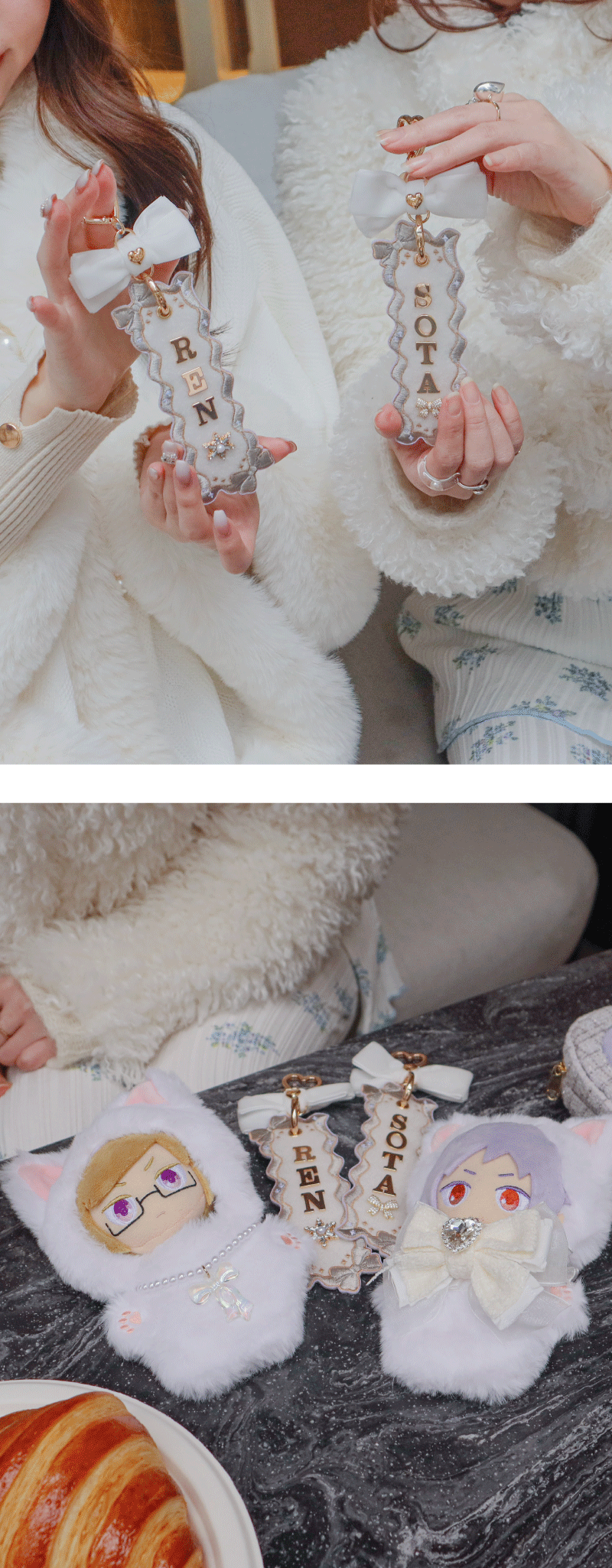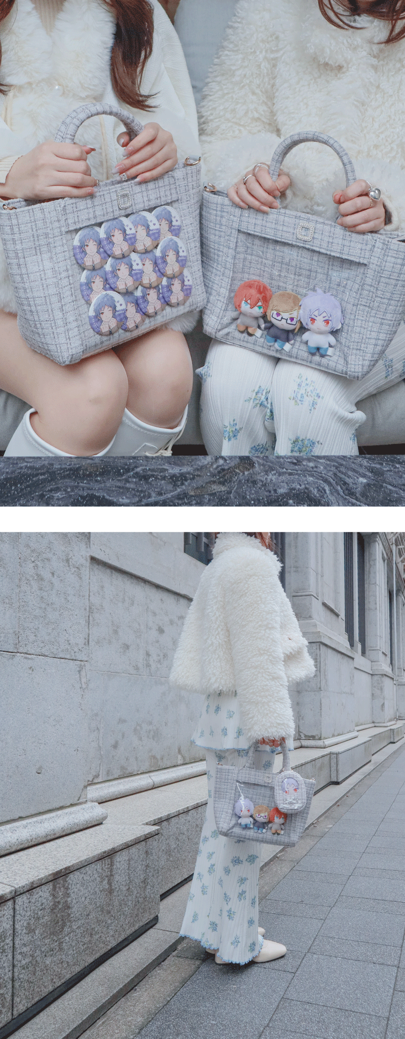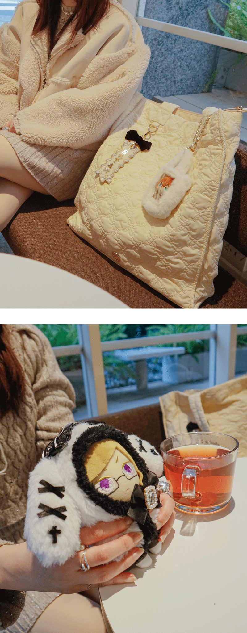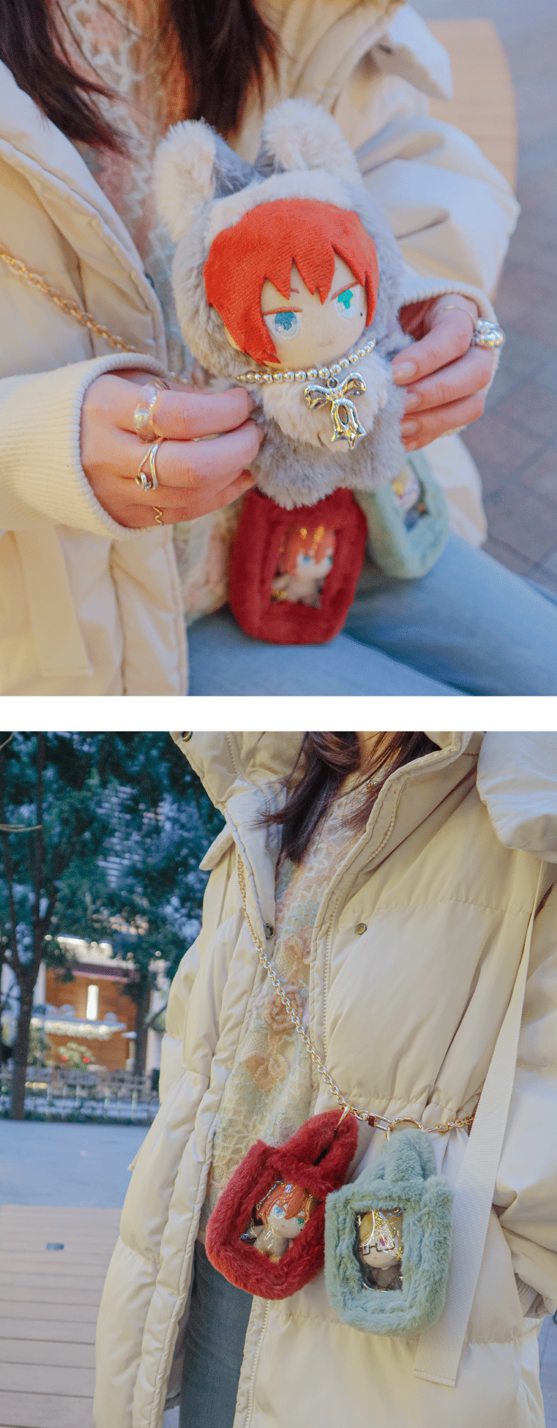 【ファンスタイル特集】冬のふわもこお出かけスタイル 寒い日も、推しと一緒にお出かけしたい!コートを着たまま外でもかわいく写真が撮りたい!ふわふわもこもこのファッションに合わせて楽しめるfanfancy+の冬コーディネートをご紹介今回は3つのファンスタイルシーンをピックアップ!□ Scene 1 Fluffy冬の現場に防寒&しっかりかわいく!□ Scene 2 White真っ白がかわいいホワイトコーデ□ Scene 3 Casualカジュアルスタイルに遊び小物をプラス Scene 1 Fluffy 冬の現場に防寒&しっかりかわいく! 淡い色のふわふわファーコートを着たら、ぬいにもふわふわのケープを付けておめかし。うちわやペンライトの収納がついた大きなマルチトートにはぬいを入れたファーバッグチャームや推しの名前で作るネームタグキーホルダーでカスタマイズ。 キルティングマルチトートバッグ〔クリームイエロー〕5,500円/おなまえカスタム ネームタグキーホルダー〔ホワイト〕1,980円~/おなまえカスタム リボンチャーム〔ブラック〕880円/ルルリボン ゴシックぬいぐるみケープ〔ブラック/ホワイト〕2,090円~2,420円/ファーバッグチャーム〔ホワイト〕880円(1月31日店舗発売) Scene 2 White 真っ白がかわいいホワイトコーデ 友だちとふわふわのホワイトコーデでカフェへお出かけ。一緒に作ったネームタグもオールホワイトでお揃いに!ぬい服にはふわふわの「しろねこ」の着ぐるみをセレクト。ツイードリボンやパールネックレスで自分好みにカスタマイズ♪ホワイトコーデにぴったりなツイードバッグは小さくてもグッズがしっかり入る透明ポケットが◎同じシリーズのぬいポーチを付けて冬のお散歩に! おなまえカスタム ネームタグキーホルダー〔ホワイト〕1,980円~/おなまえカスタム リボンチャーム〔ホワイト〕880円/ぬいぷらす らぴぐるみカスタム〔しろねこ〕2,200円~/ぬいぷらす らぴぐるみカスタム ツイードリボン〔ホワイト〕1,540円/ぬいぷらす らぴぐるみカスタム ビーズネックレス〔パール〕880円/パレットリリーツイードショルダーバッグ〔ホワイトグレー〕6,600円/ツイードプティぬいポーチ〔ホワイトグレー〕2,970円 Scene 3 Casual カジュアルスタイルに遊び小物をプラス ダウンジャケットにデニムを合わせたカジュアルな日は、バッグや小物で遊ぶ気分。つやつやのパール生地にコットンのレースがかわいいぬい用の巾着はバッグみたいに持つのがかわいい♪かっこいい推しに着せたいぬい服はおおかみの着ぐるみとシルバーのネックレス。小さめのぬいを入れたファーバッグチャームは好きなショルダーチェーンに2個付け!カラーを選べばコーデのポイントに。 パールキルティングぬい巾着〔ホワイト/ブルー〕2,750円/ぬいぷらす らぴぐるみカスタム〔おおかみ〕2,200円~/ぬいぷらす らぴぐるみカスタム ビーズネックレス〔シルバー〕880円/ファーバッグチャーム〔レッド/グリーン〕880円(1月31日店舗発売) fanfancy+のふわもこアイテムを組み合わせて自分だけのファンスタイルをコーディネートしてみてくださいね♪ ピックアイテムはこちら TOP