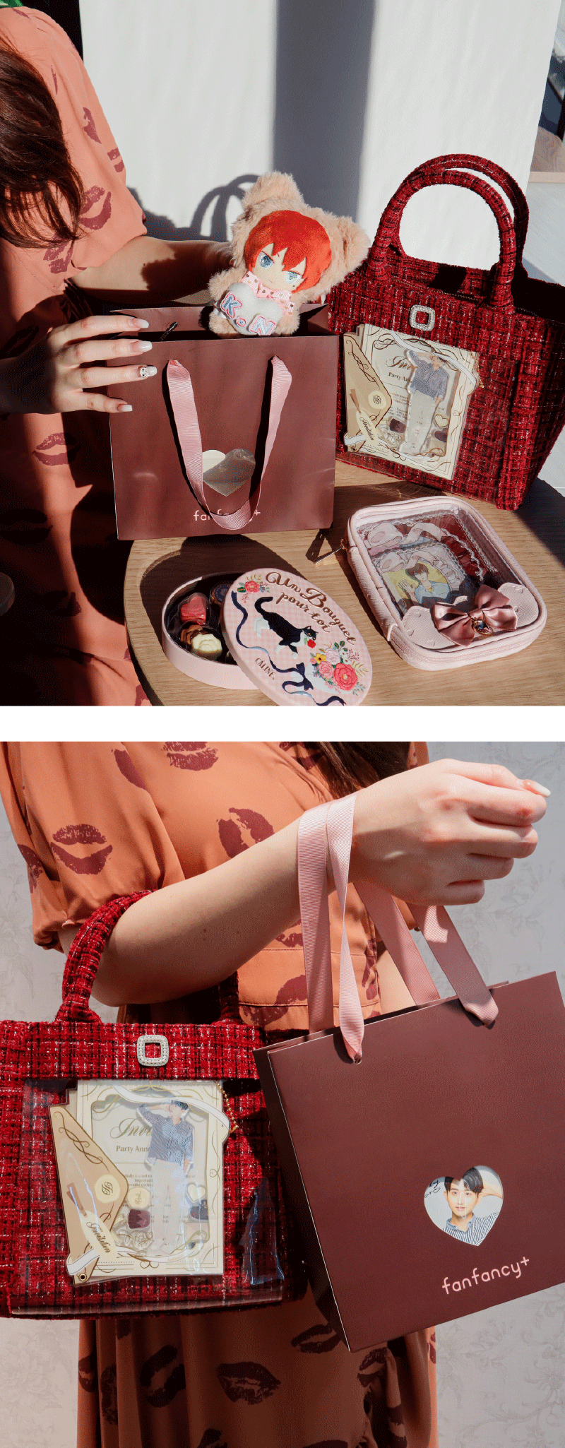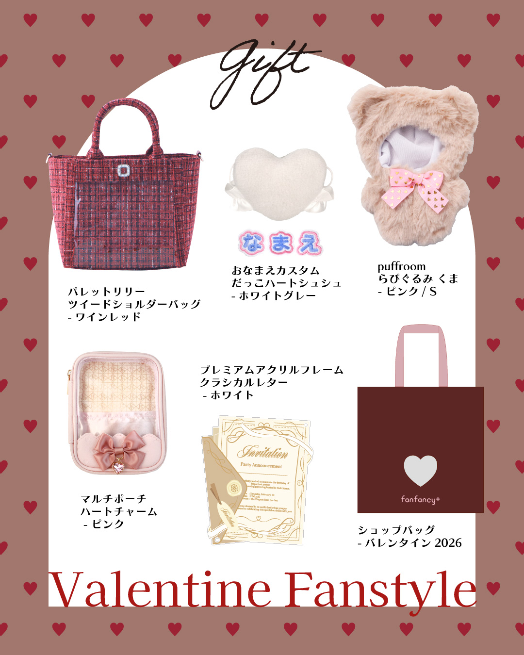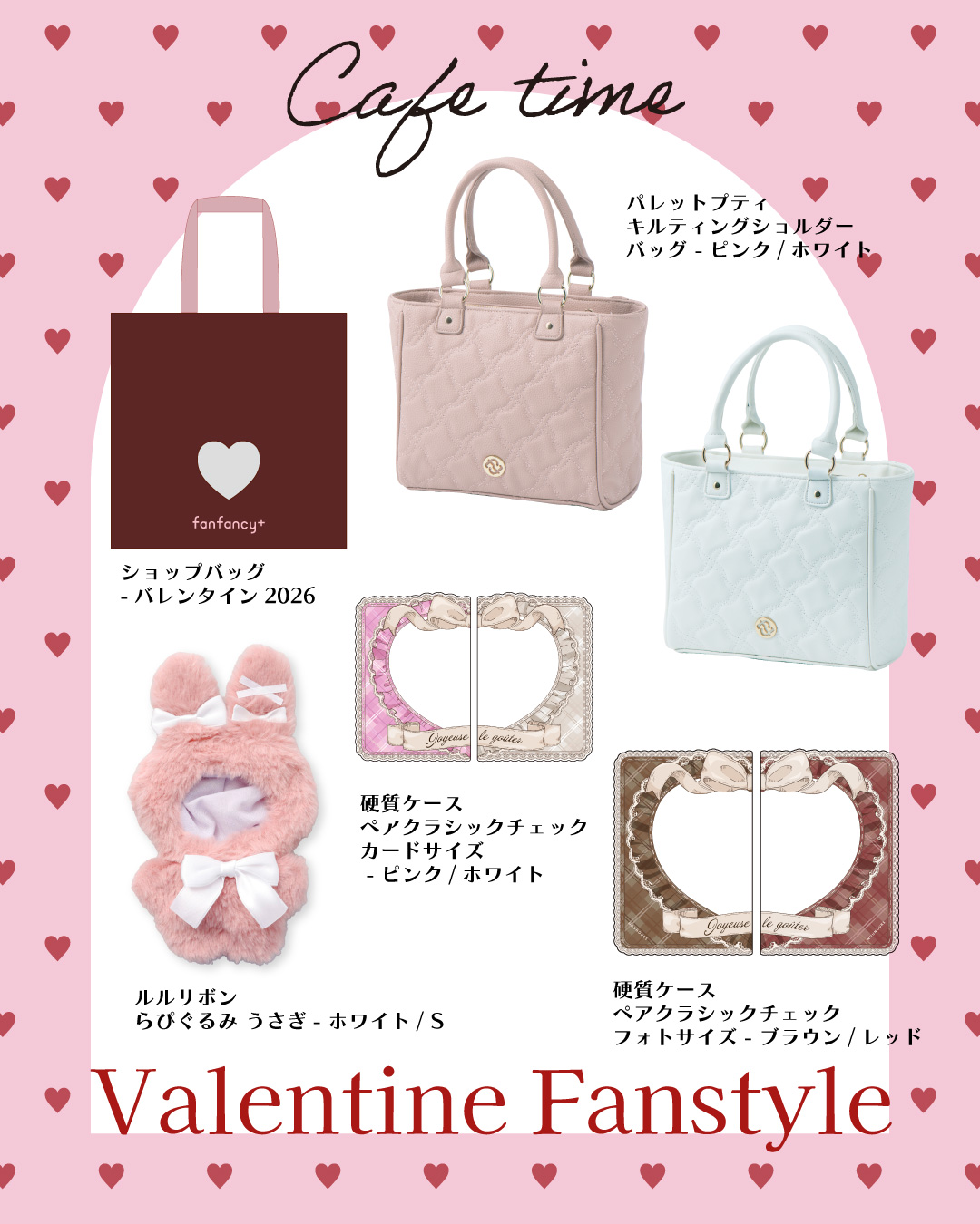 【ファンスタイル特集】推しに捧げるバレンタインな1日 今年もまもなくバレンタイン!友人や恋人とプレゼントを贈り合ったり、自分や推しにチョコを買ったり、アフタヌーンティーを楽しんだり。甘めのテイストにあわせた2月はブラウンやピンクな気分!バレンタインのお出かけやギフトにぴったりなfanfancy+のコーディネートをご紹介今回は2つのファンスタイルシーンをピックアップ!□ Scene 1 Cafe timeブラウン&ピンクが気分のカフェコーデ□ Scene 2 Giftチョコレートに推しを添えたギフトアイデア Scene 1 Cafe time ブラウン&ピンクが気分のカフェコーデ バレンタイン限定のアフタヌーンティーやカフェへぬいを連れてお出かけ♪チョコレートのスイーツにあわせてブラウン系のお洋服を選んだらピンクやホワイトの痛バがぴったり!友だちとお揃いで持つと写真映えも○ぬい服にはピンクのうさぎをセレクト。スイーツの世界観にも馴染むかわいさ。 今年注目のペア硬質ケースはバッグに入れてもかわいいし、2つを両手で持って撮影するのもおすすめ。キルティングショルダーバッグにはフォトサイズを並べて入れるとぴったり。fanfancy+でお買い物するともらえるバレンタインショッパーからぬいを覗かせるとかわいい♪ ルルリボン らぴぐるみ うさぎ〔ホワイト〕1,980円~2,310円/硬質ケース ペアクラシックチェック カードサイズ〔ピンク/ホワイト〕770円/硬質ケース ペアクラシックチェック フォトサイズ〔レッド/ブラウン〕880円/パレットプティ キルティングショルダーバッグ〔ピンク/ホワイト〕6,600円/fanfancy+ バレンタインショップバッグ〔非売品〕 Scene 2 Gift チョコレートに推しを添えたギフトアイデア 今年は、友だちの推しをイメージしたぬいセット!ぬい服にくまの着ぐるみ&名前のワッペン付きのぬいがハートをだっこできるキュートなアイテムを組み合わせて、パッケージがかわいいチョコレートと一緒にプレゼント!アクスタ・カード派の子へのプレゼントにはポーチのアイテムもおすすめ!お出かけにはワインレッドのツイードバッグ。今年のバレンタイン新作、クラシカルレターのアクリルフレームはゴールドがキラキラでポケットに入れても○バレンタインショッパーは、ハート窓のところにカードスリーブがついていて、好きなカードを入れて渡せる優れもの。 パレットリリーツイードショルダーバッグ〔ワインレッド〕6,600円/プレミアムアクリルフレーム クラシカルレター 〔ホワイト〕3,960円/puff room らぴぐるみ くま 〔ピンク〕1,980円~2,310円/おなまえカスタム だっこハートシュシュ〔ホワイトグレー〕1,782円/マルチポーチ ハートチャーム〔ピンク〕2,420円/fanfancy+ バレンタインショップバッグ〔非売品〕 fanfancy+のバレンタインショップバッグはFUKUYA ONLINE、fanfancy+ with GiGO各店で3,000円以上お買い上げのお客様にプレゼントしています!この機会にぜひゲットしてください♪※FUKUYA ONLINEでは「すぐお届け」アイコンが付いた商品の合計金額が対象です。 ピックアイテムはこちら TOP